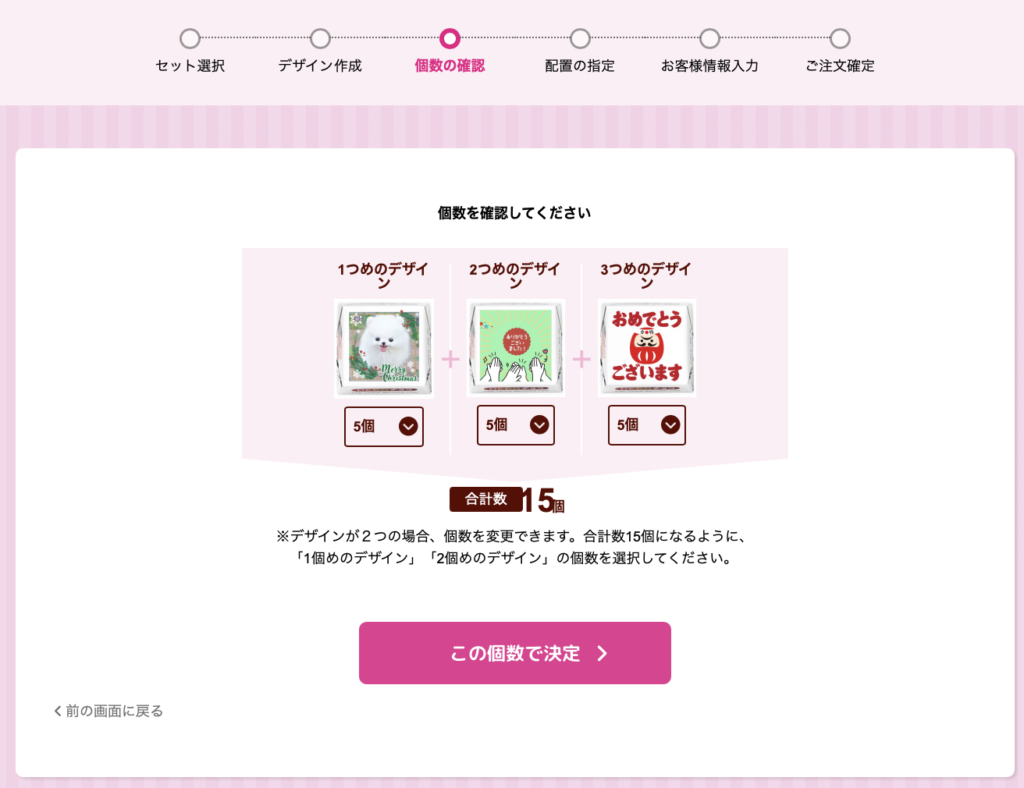 全て同じデザイン、または2つのデザインで個数を10個・5個と注文することも可能。