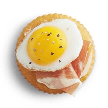 作り方:リッツの上にカリカリベーコンと小さな目玉焼きをのせる。食べごたえがあり、ミニサイズの朝ごはんにぴったり。
