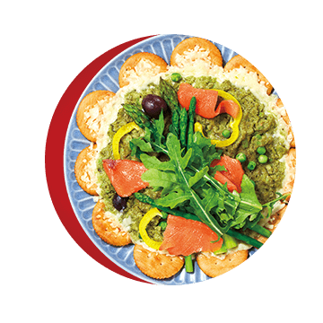 カラフルなトッピングを並べれば、それだけで立派なパーティープレートに。お皿の中央にディップを置き、周囲にリッツを円形に並べると華やかです。